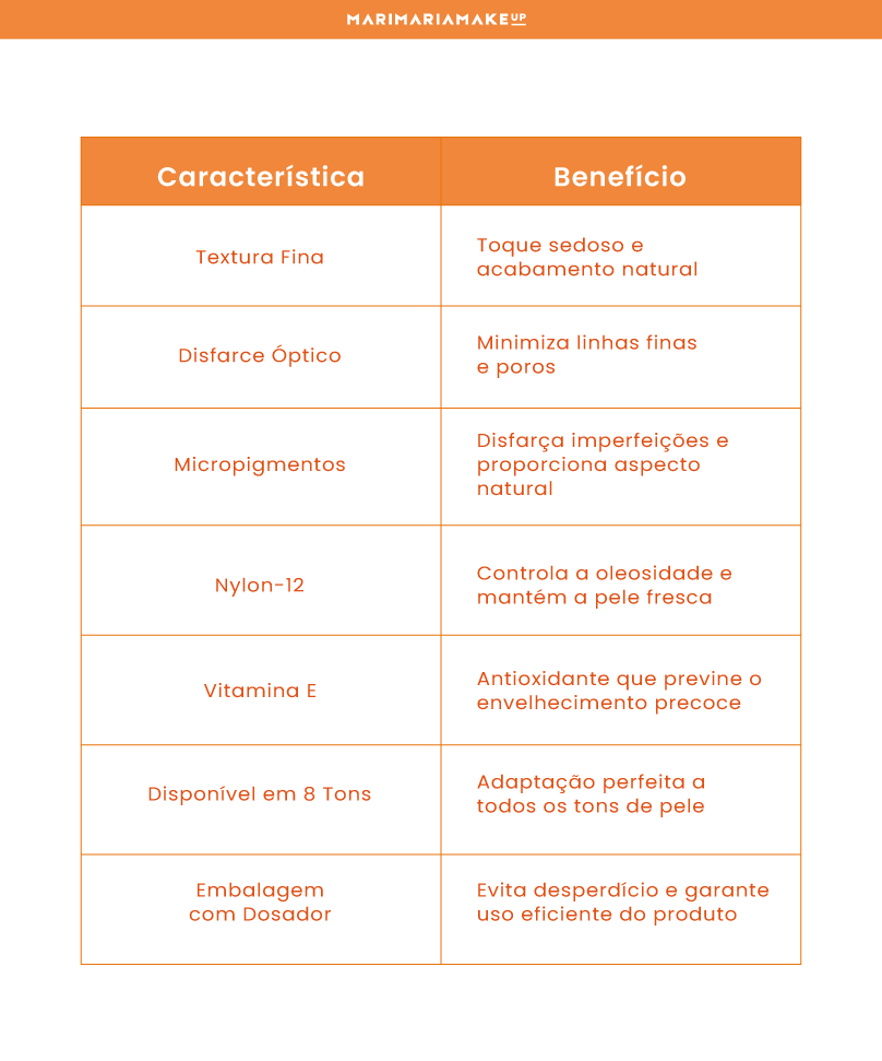 Textura Fina e Aveludada: Desliza suavemente sobre a pele, proporcionando um toque sedoso e um acabamento natural. ?Disfarce Óptico: Partículas especiais que minimizam a aparência de linhas finas e poros, garantindo uma pele uniforme. Micropigmentos: Ajudam a disfarçar imperfeições, conferindo um aspecto natural e radiante. Nylon-12: Controla a oleosidade da pele, mantendo-a fresca e sem brilho excessivo ao longo do dia. Vitamina E:Um poderoso antioxidante que combate os radicais livres, ajudando a prevenir o envelhecimento precoce da pele. ?Respirabilidade: Fixa e sela a maquiagem sem obstruir os poros, permitindo que a pele respire livremente.