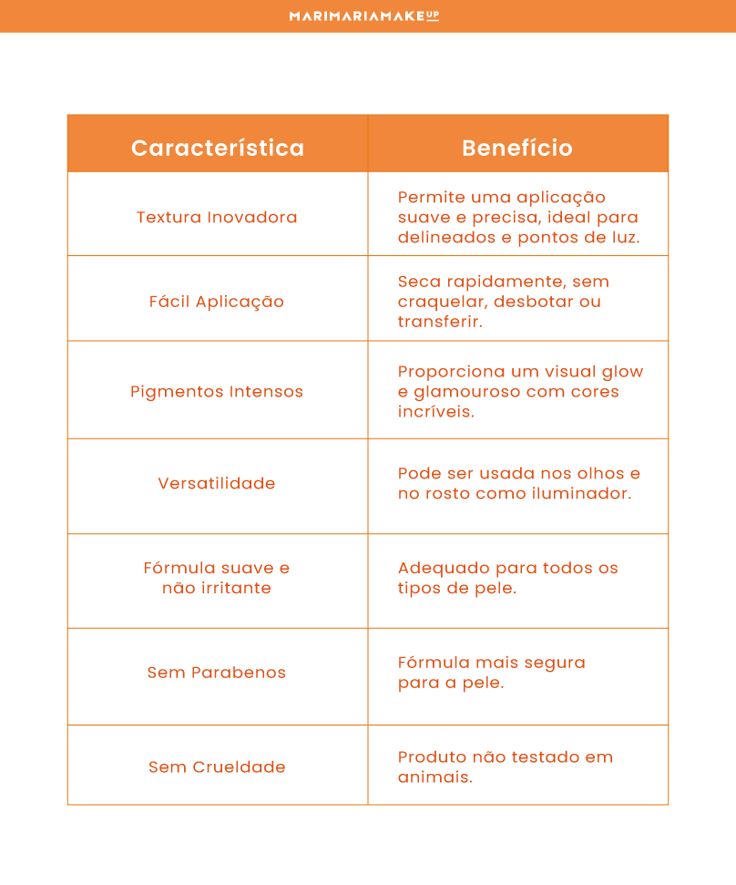 Para dar aquele glow! Pode ser utilizada nos olhos para um acabamento impecável ou no restante da face como iluminador.