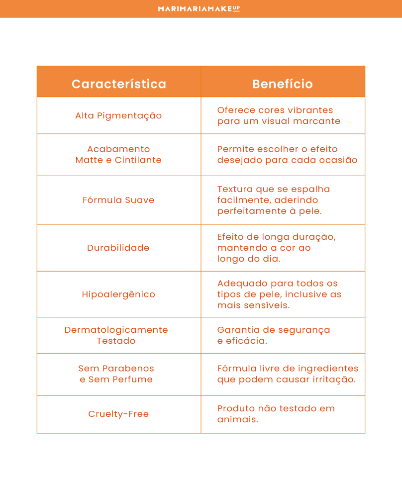 Alta Pigmentação: Fórmula altamente pigmentada que oferece cores intensas e vibrantes, garantindo um visual marcante. Acabamento Matte e Cintilante: Disponível em acabamentos matte e cintilante, permitindo que você escolha o efeito desejado para cada ocasião. Fórmula Suave: Textura suave que se espalha facilmente, aderindo perfeitamente à pele para um acabamento natural e duradouro. Durabilidade: Proporciona um efeito de longa duração, mantendo suas maçãs do rosto coradas e vibrantes ao longo do dia.